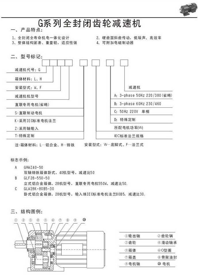G系列全封閉齒輪減速機產品特點型號標記結構圖例